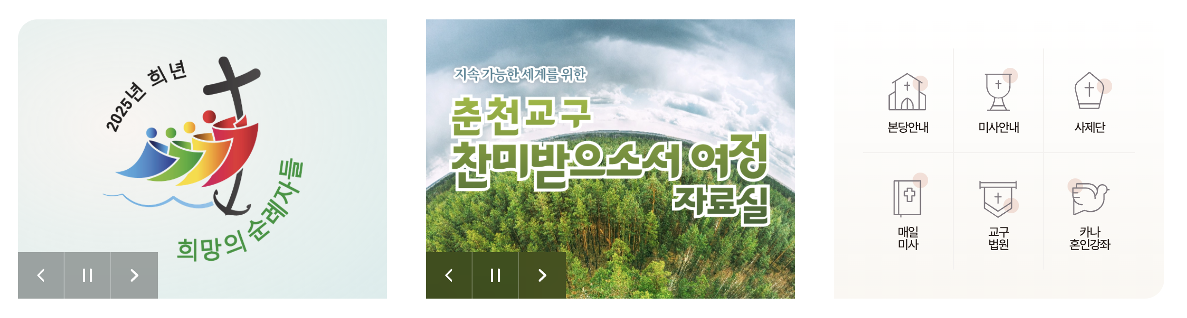홈페이지는 PC와 모바일 모두 최적화된 반응형 구조로 설계되어 있어 신자들이 언제 어디서나 정보를 쉽게 접할 수 있도록 구성되어 있습니다. 중요 메뉴는 직관적인 UI로 배치되어 있어, 사용자가 원하는 정보를 빠르게 찾을 수 있습니다.